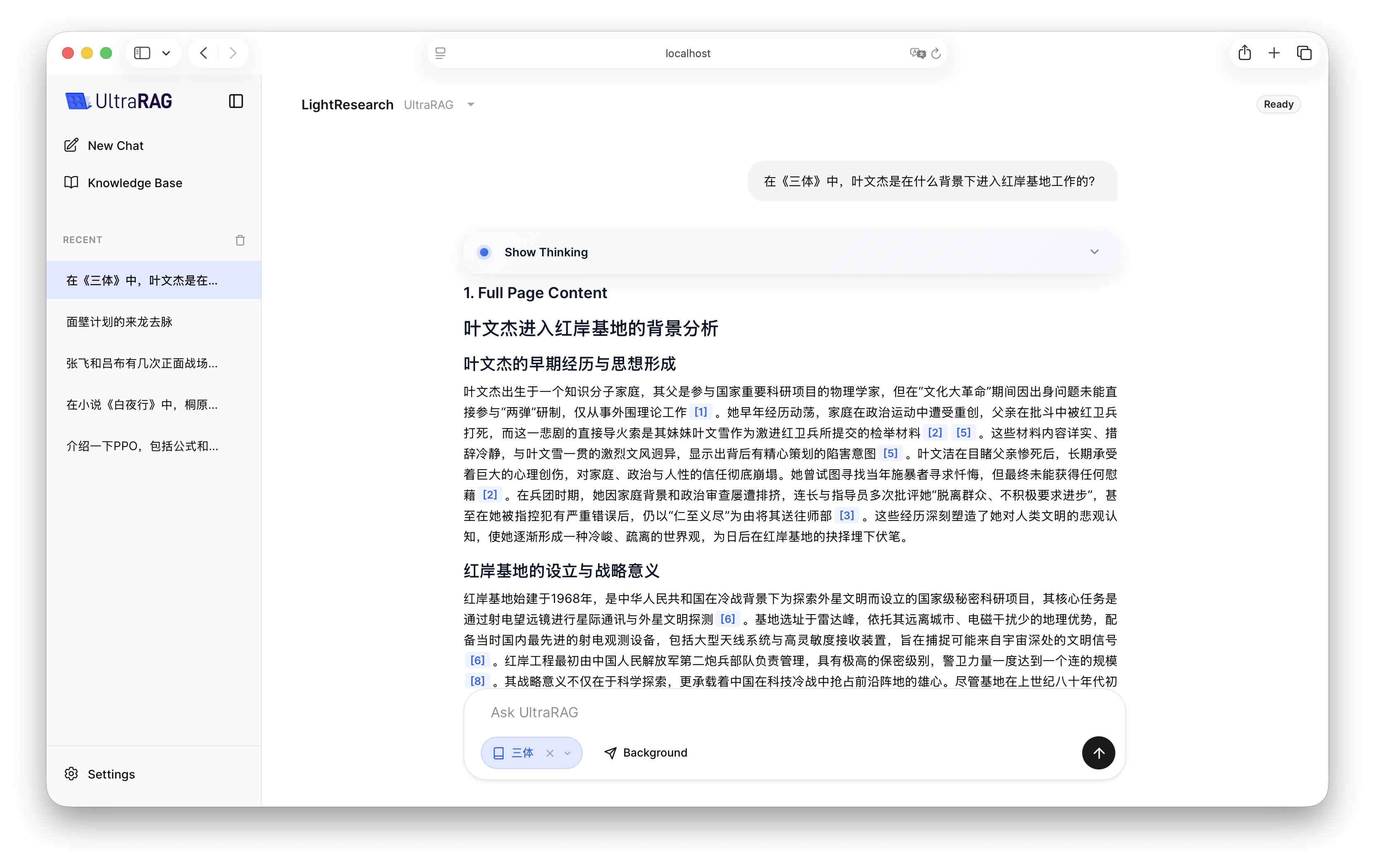 配置完成后,在 UltraRAG UI 中启动 LightResearch Pipeline。 与标准 RAG 不同,你会观察到系统在给出最终回答前,会经历多轮自主思考与检索过程,最终生成一份包含多级标题、详实论据且带有准确引用的深度综述。