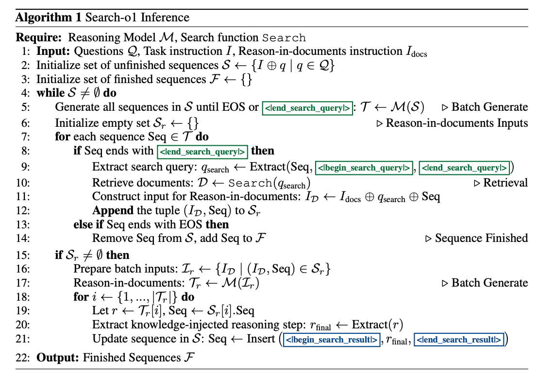 论文:https://arxiv.org/pdf/2501.05366Search-o1 的核心思想是让大模型在推理过程中自主判断何时缺乏知识,并主动生成搜索查询以调用外部检索模块获取补充文档。随后通过设计的 Reason-in-Documents 模块对冗长检索结果进行“分析—精炼”,提取有用信息再注入后续推理,从而减少噪声干扰。